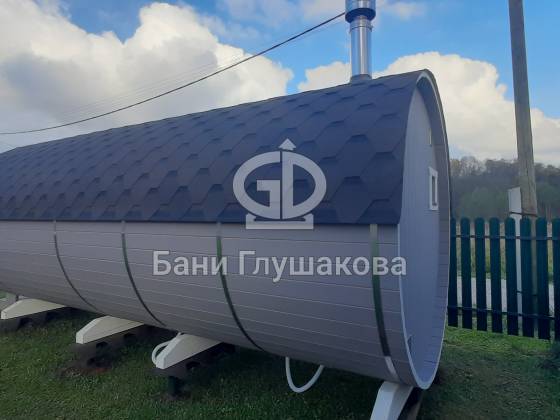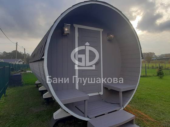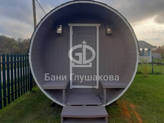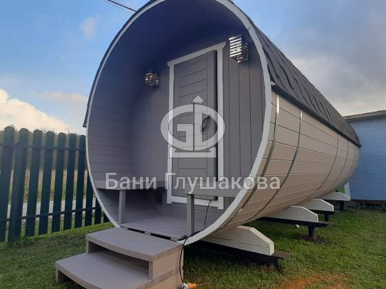 Эта круглая красавица — идеальный вариант для тех, кто ценит эстетику классической бани-бочки, но хочет получить современный комфорт и долговечность конструкции.