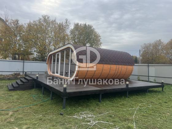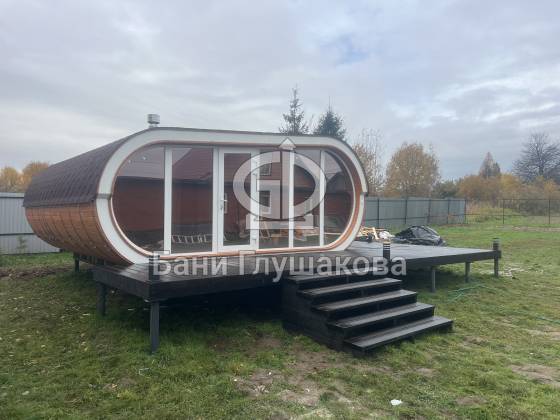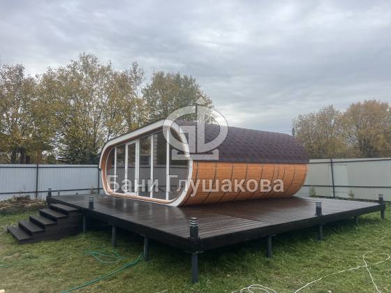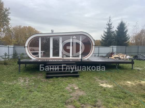 На этот раз мы построили баню «Танк Панорама» — современный вариант с панорамным остеклением и просторной террасой-подиумом.