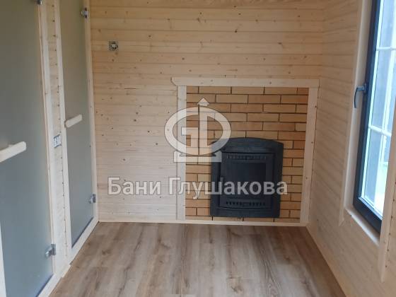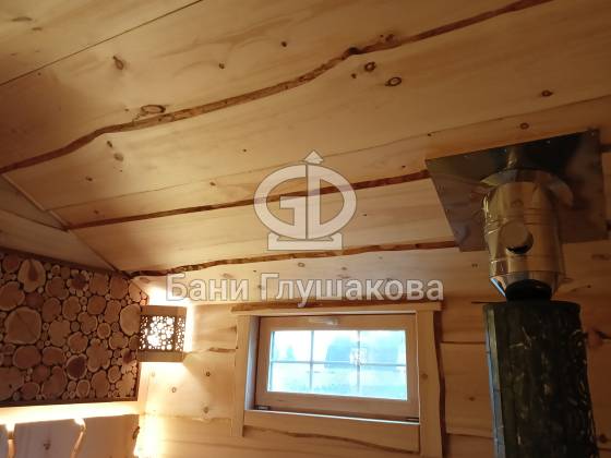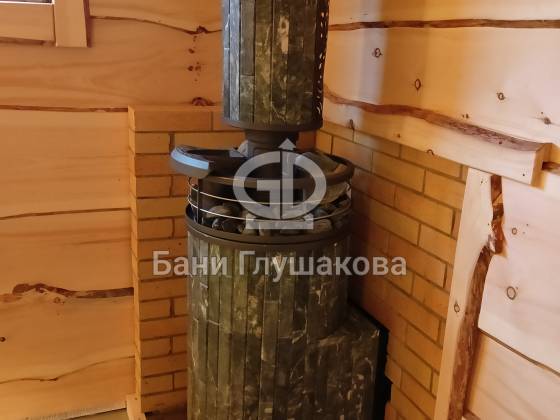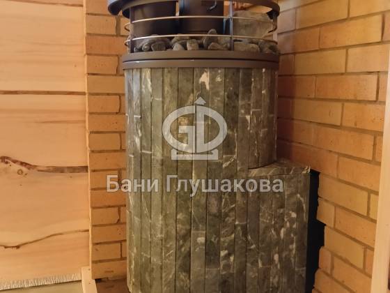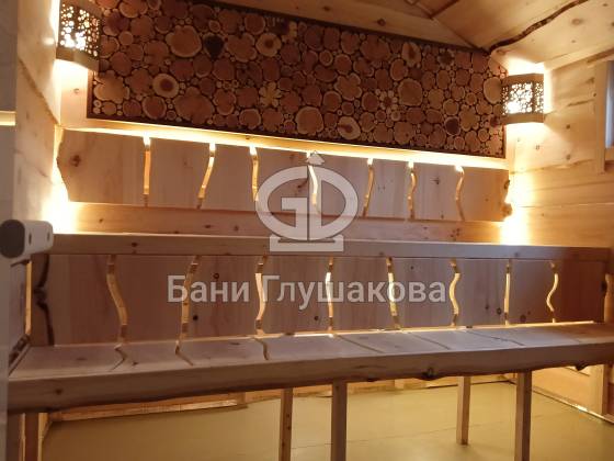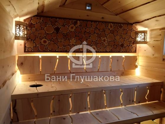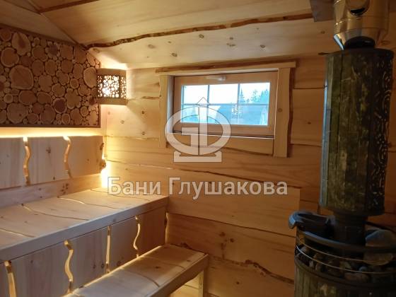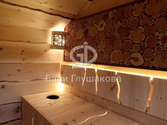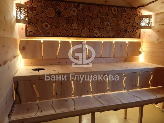 В парной — отделка из необрезной доски, создающая эффект живого, «дикого» дерева. Во всю стену — панно из спилов можжевельника, наполняющее воздух мягким ароматом и природной энергетикой. Печь с кирпичным экраном не просто греет, она будто камин, перед которым хочется задержаться.