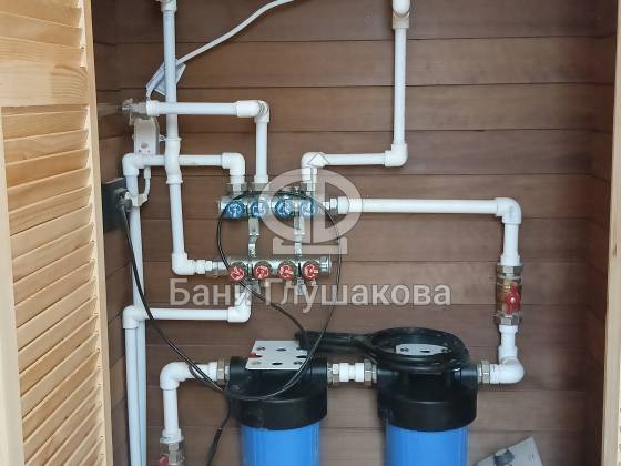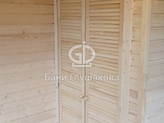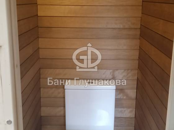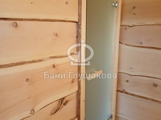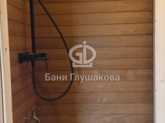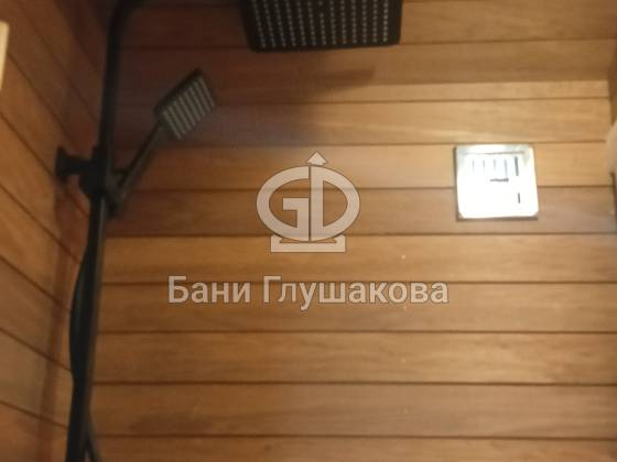 Душевая отделана термовагонкой, устойчивой к влаге и перепадам температуры, — практично, красиво и долговечно.