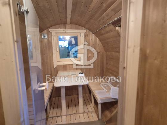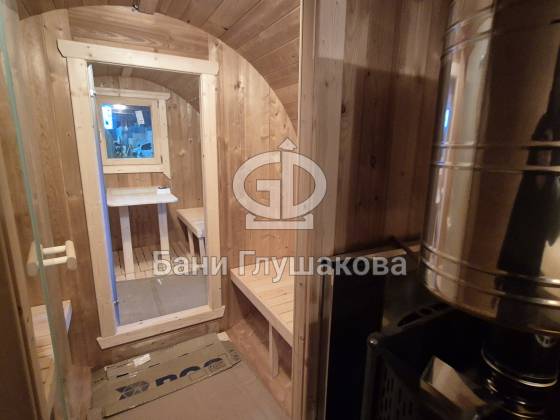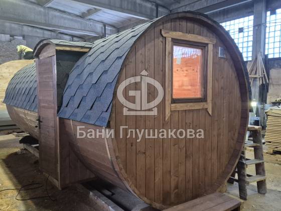 Я сфотографировал эту баню в цеху, чтобы вы могли рассмотреть её ещё до того, как она отправится на участок. Это классическая круглая баня-бочка, но с одним очень весомым преимуществом — она полностью собрана из термодерева.