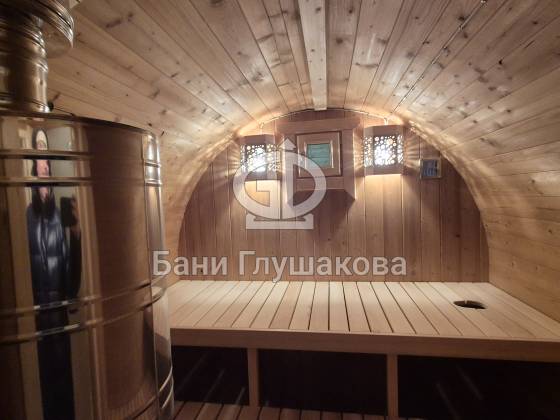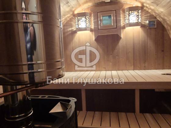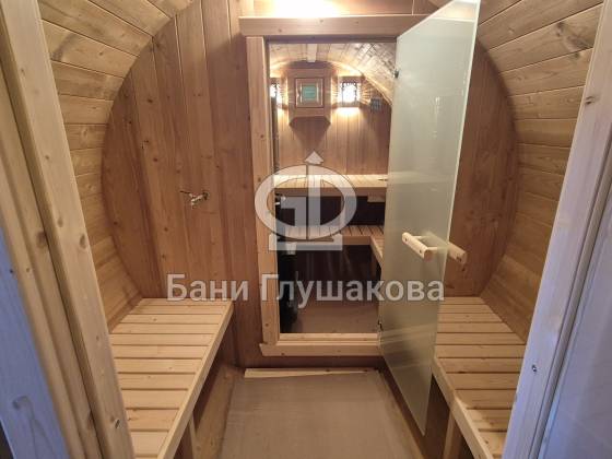 Круглая баня из термодерева с центральным входом