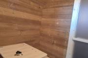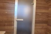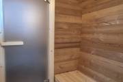 Баня сделана из отсортированной термодоски — мы отобрали хорошее дерево, но с небольшими косметическими изъянами. Ничего критичного, просто живой материал с характером.