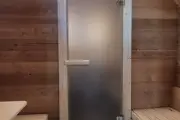 Баня сделана из отсортированной термодоски — мы отобрали хорошее дерево, но с небольшими косметическими изъянами. Ничего критичного, просто живой материал с характером.