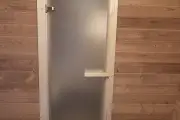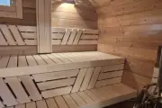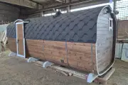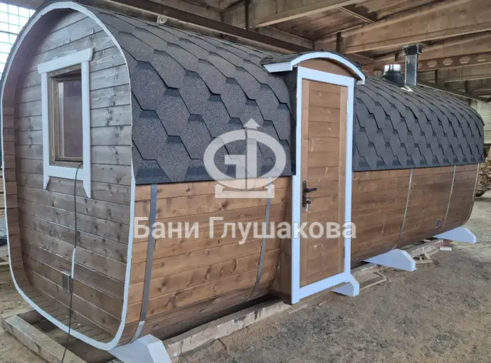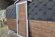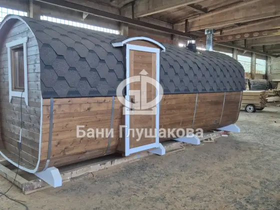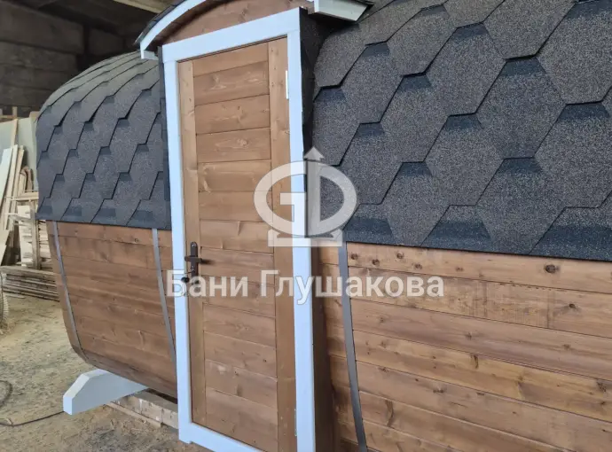 Баня сделана из бочковой термодоски, которая идеально подходит для строительства бань-бочек – она не набирает влагу и не рассыхается при смене сезонов. Подтягивать эту баню не нужно.