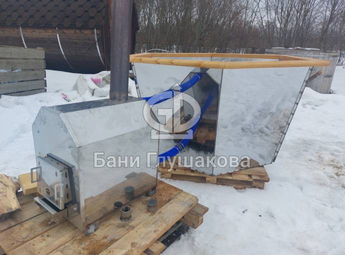 Чан укомплектован мощной наружной печью для купелей «ГИД 3» на 27 кВт. Нагрев чана в зависимости от температуры воды, объёма и температуры окружающей среды занимает 2-3 часа.
