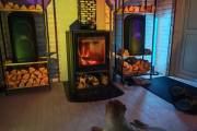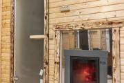 Если топка через стену то можно сделать красивые наличники из брашированной доски с полочкой на верху,