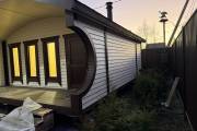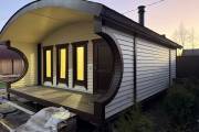 Баня оснащена относительно большой террасой 2 на 3 метра. Пол террасы вымощен композитной доской. Боковые стены украшены округлыми вырезами — они составляют симпатичный дуэт с фирменной округлой крышей.