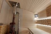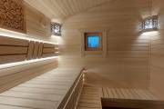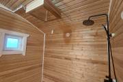 Баня выполнена из сухого бруса и полностью сохраняет стилистику «Бурже»: округлая крыша, аккуратные пропорции, выразительная отделка и продуманная функциональность. Для большего комфорта мы предусмотрели большое окно в комнате отдыха — теперь помещение наполнено светом и визуально кажется ещё просторнее.
