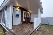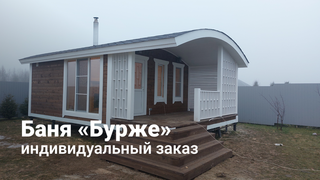В итоге получилась индивидуальная версия популярной модели: узнаваемая баня «Бурже» с характерной крышей и красивой террасой, но адаптированная под конкретный фундамент и потребности клиента.
