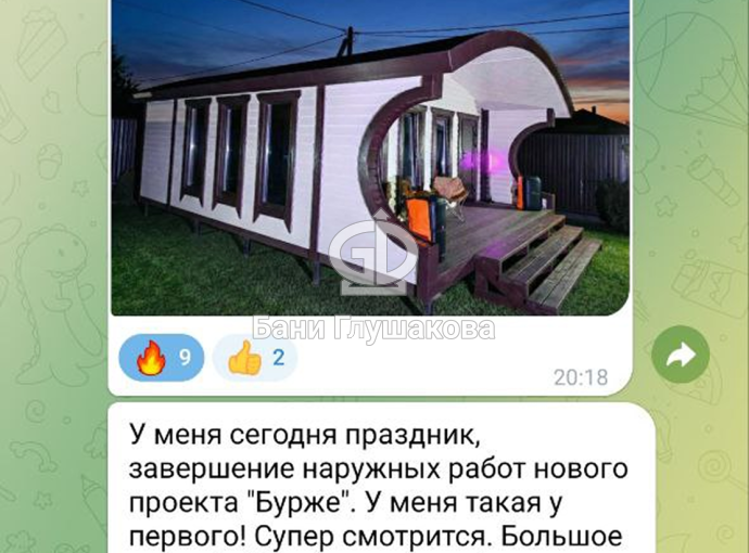 Баню «Бурже» придумали именно мы. Наша же компания их и строит. А то, что бывает не дозвониться — есть такое. Мы очень маленькая компания, у которой летом много работы. Извините, если не смогли вовремя взять трубку.