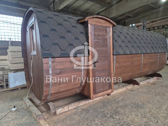 Перевозная квадробочка совмещает в себе классическую баню в виде бытовку с оригинальной круглой баней бочкой. С одной стороны конфигурация более привычная, а с другой — необычный дизайн.