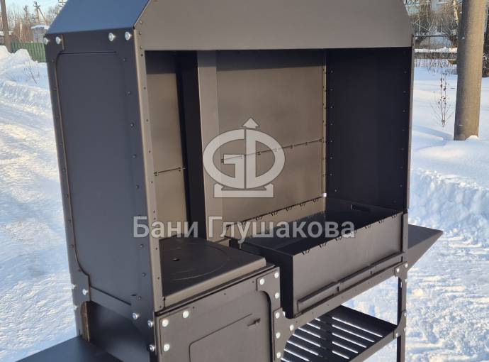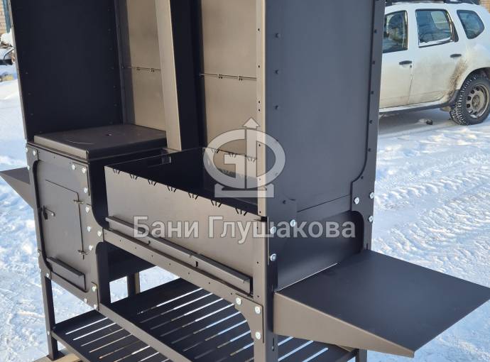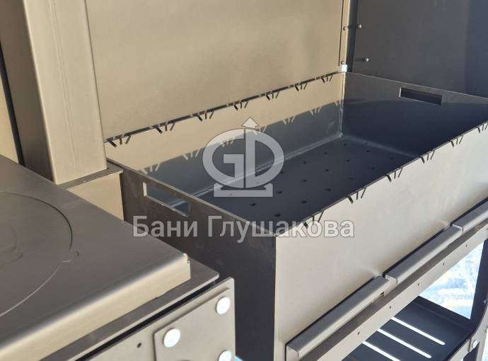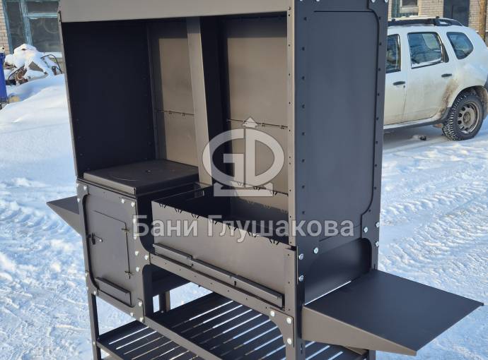• Продуманная эргономика: Мы предусмотрели боковые столики для посуды и специй, а также вместительную нижнюю полку для хранения дров и угля. Всё необходимое всегда под рукой.