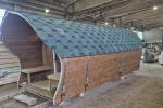 Новая модель перевозной бани в готовом исполнении из линейки куполообразных бань «София». Длина составляет 5 метров (внутренние помещения, не считая террасы). Ширина 2,2 м — максимальные габариты для мобильной бани.
