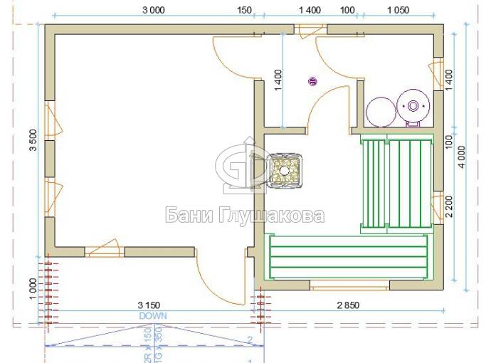 Внутри 4 помещения: комната отдыха, парная, душевое помещение и бойлерная. Площадь позволяет организовать полноценный санузел.