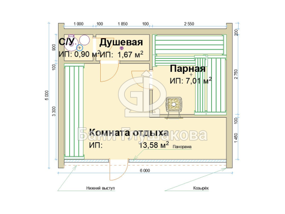 Планировка включает в себя комнату отдыха, парную, душ, бойлерную/санузел и спальню.